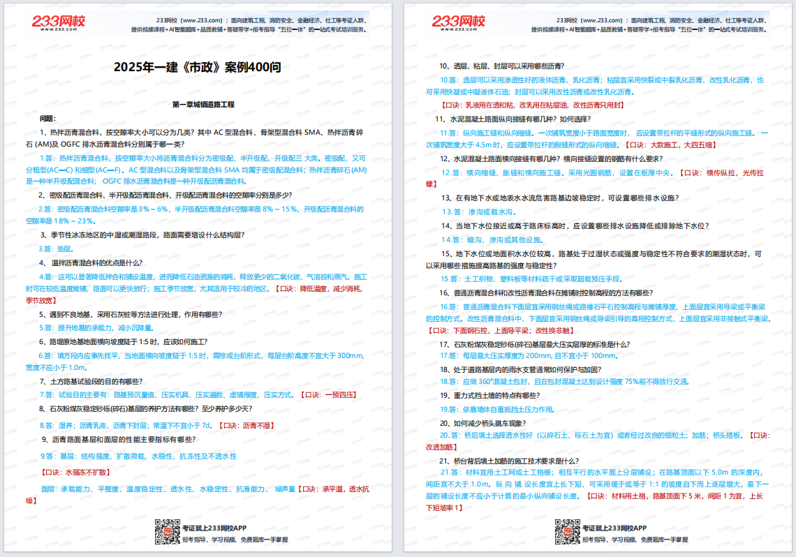 ▶解锁全部精华: 想要掌握全部400个核心问题及答案解析,以及凌平平老师对每个问题的深度剖析、答题技巧点拨和拓展预测?购买凌平平老师2025年一建《市政实务》系统课程,即可免费获赠完整版《案例400问》及配套精讲!课程将带你系统梳理教材,深入理解规范,把握案例,实现案例突破!进入了解课程
